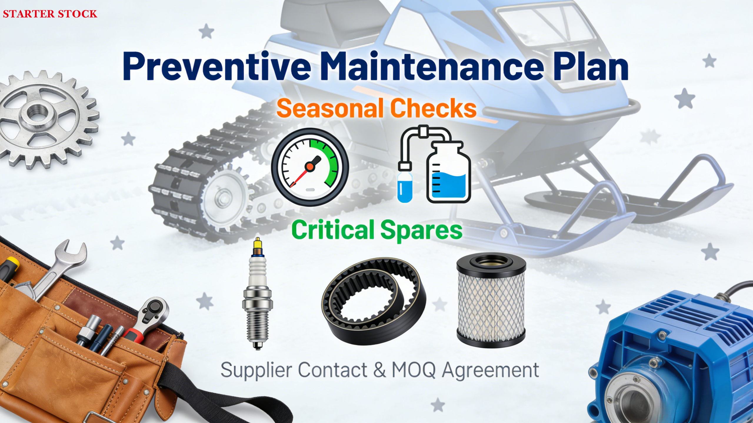 Stock critical spares: plugs, belts, filters, seals.
